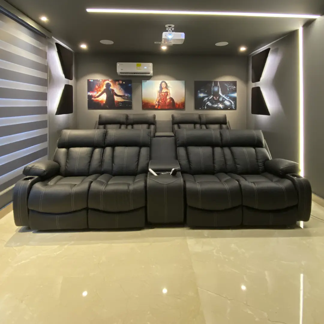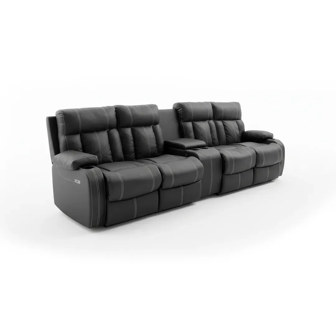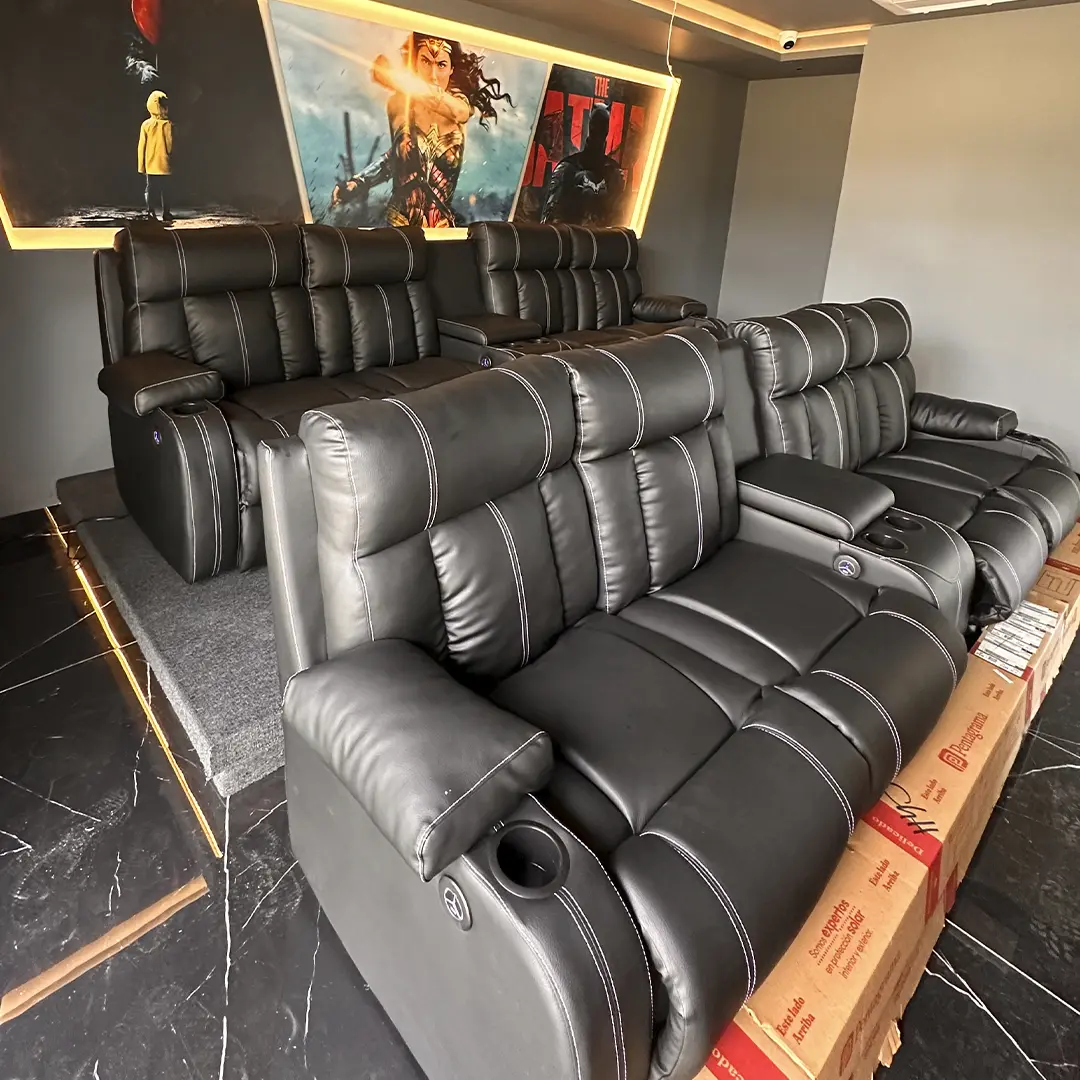 Nuestros elegantes asientos de cine Eón 4 ofrecen una experiencia cinematográfica extravagantemente lujosa con su diseño curvilíneo único. Ofreciendo en abundancia una gama de opciones reclinables así como comodidad en cuanto a controles y funcionalidad. Un espectáculo. Esta silla es un diseño contemporáneo acabado en hermoso cuero prana con portavasos con acabado negro.